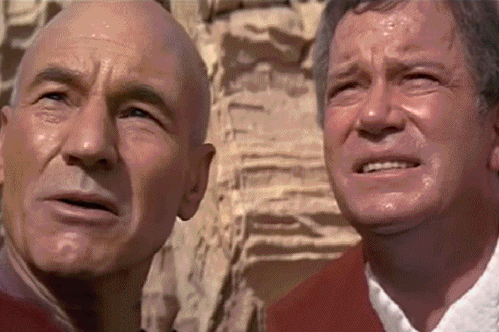 You see, in 2293, Soran is rescued from the Energy Ribbon by a retired Captain James T Kirk, who is attending a maiden voyage of a new USS Enterprise-B. Then, in 2371, while answering a distress call, Captain Jean Luc Picard finds Soran - and he has a weapon capable of destroying stars.